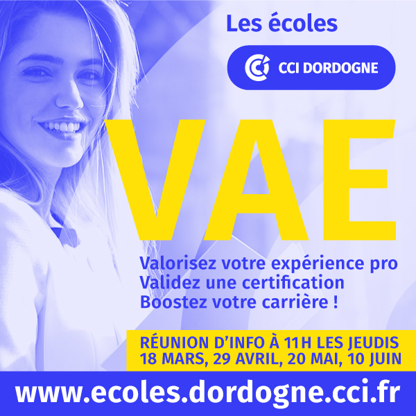 INFOS ET FORMULAIRE D’INSCRIPTION => https://www.ecoles.dordogne.cci.fr/vae-validation-des-acquis-par-lexperience/