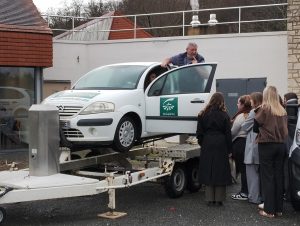La voiture tonneau est un outil pédagogique développé par Groupama pour sensibiliser efficacement à la sécurité routière.